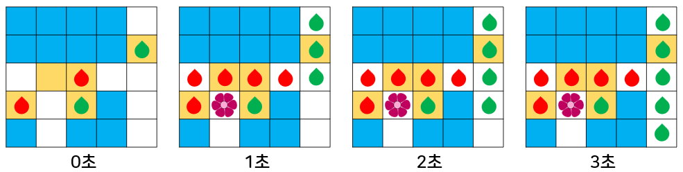 초록색 배양액과 빨간색 배양액이 동일한 시간에 도달한 땅에서는 두 배양액이 합쳐져서 꽃이 피어난다. 꽃이 피어난 땅에서는 배양액이 사라지기 때문에 더 이상 인접한 땅으로 배양액을 퍼트리지 않는다.